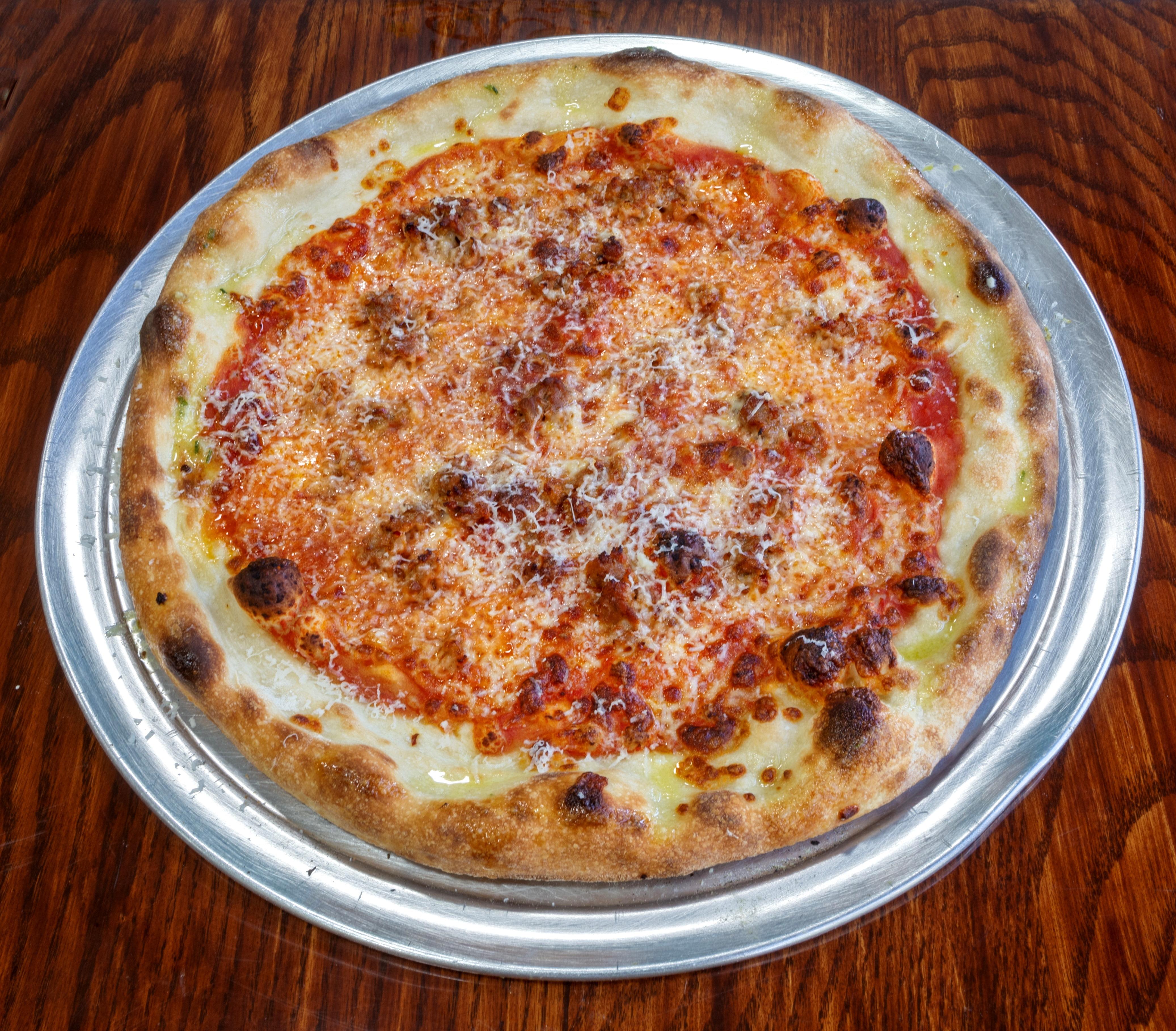 Tomato Sauce topped with Mozz, Grated Pecorino and Spicy Italian Sausage Crumbles.