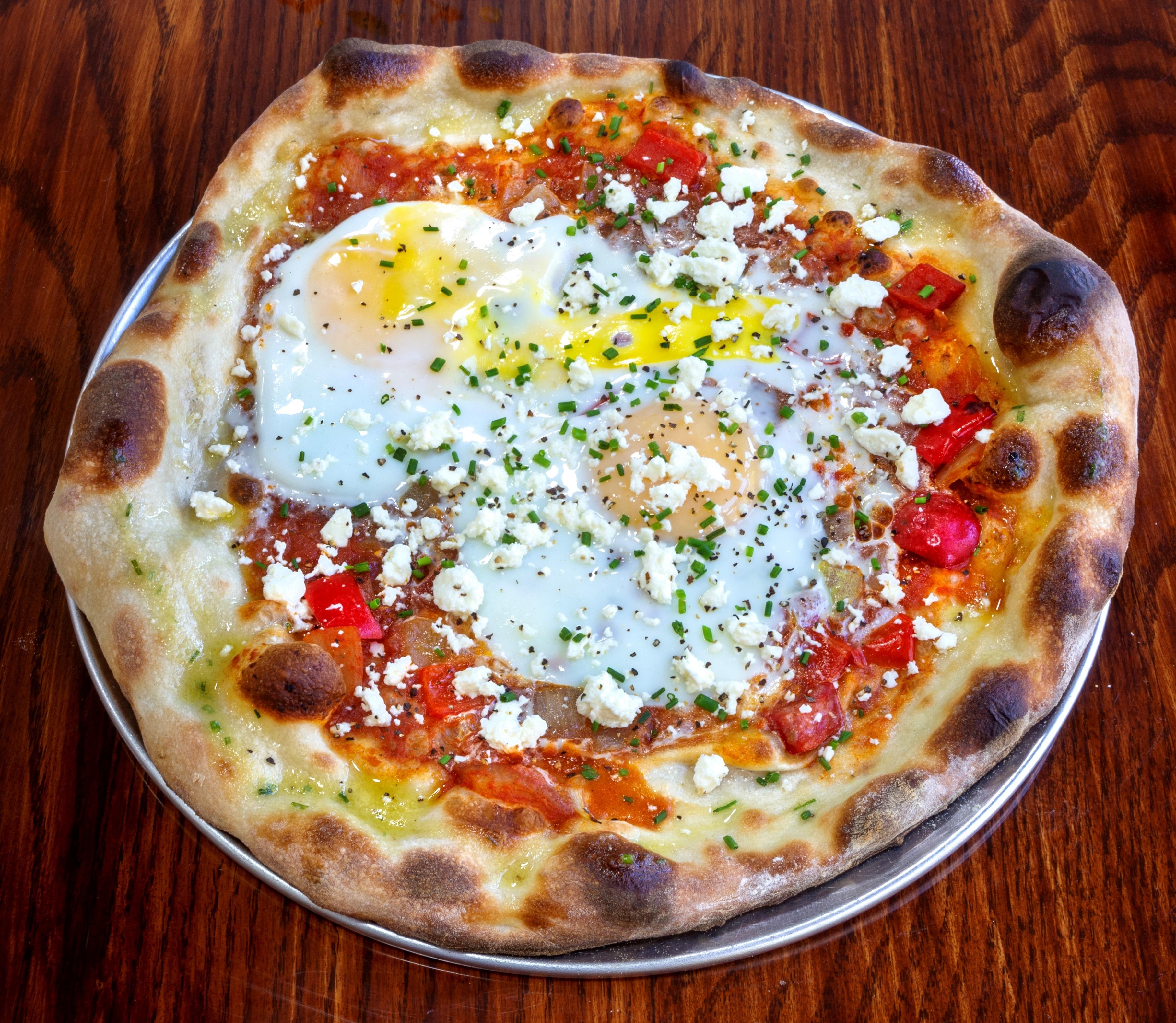 Slightly Spiced Tomato base topped with Red Peppers, Onions, Mezz, and finished with 2 Sunny Side Eggs.