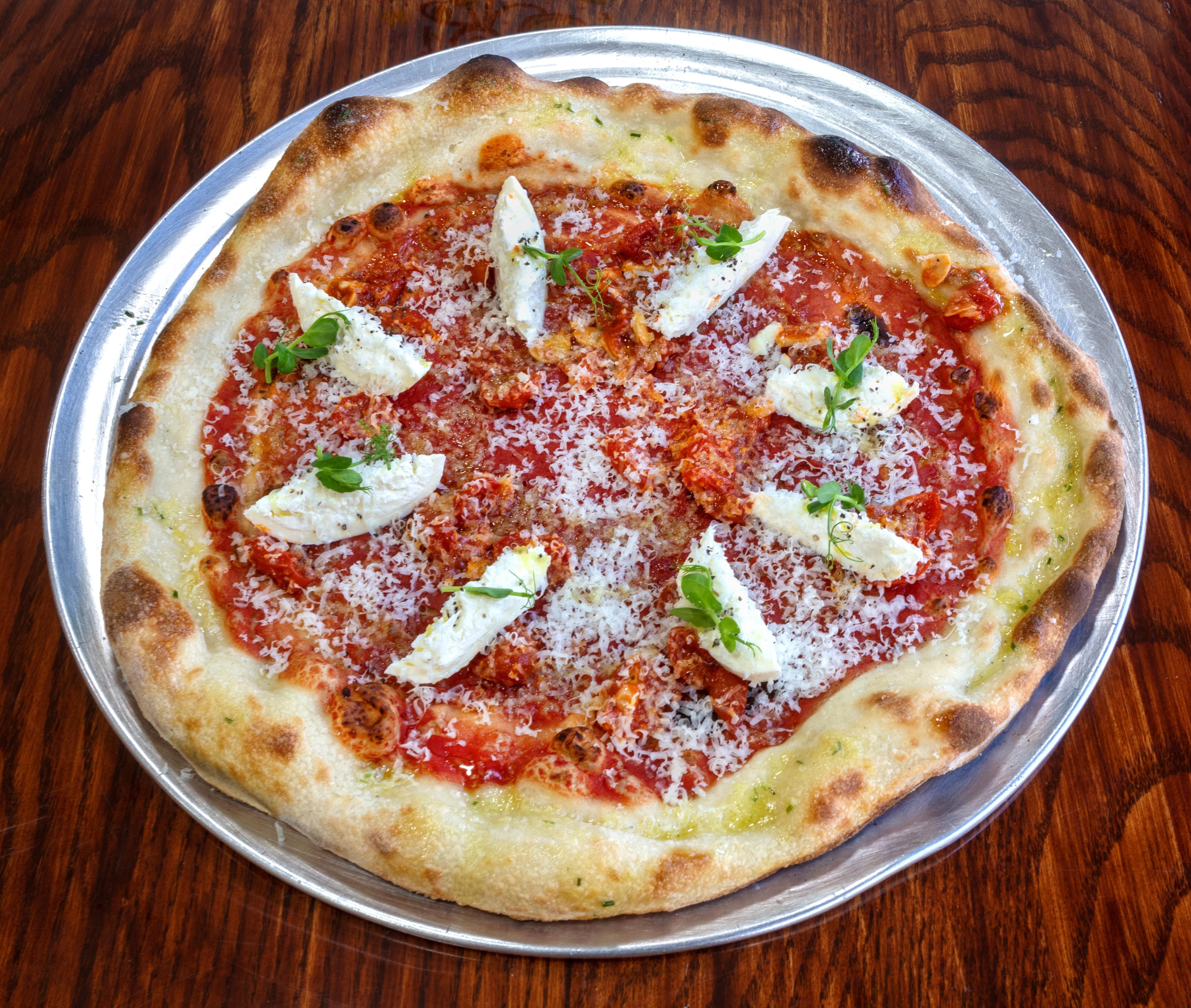 Base Sauce of only Roasted Cherry Tomato and Garlic. Topped with Sliced Burrata and Shaved Pecorino