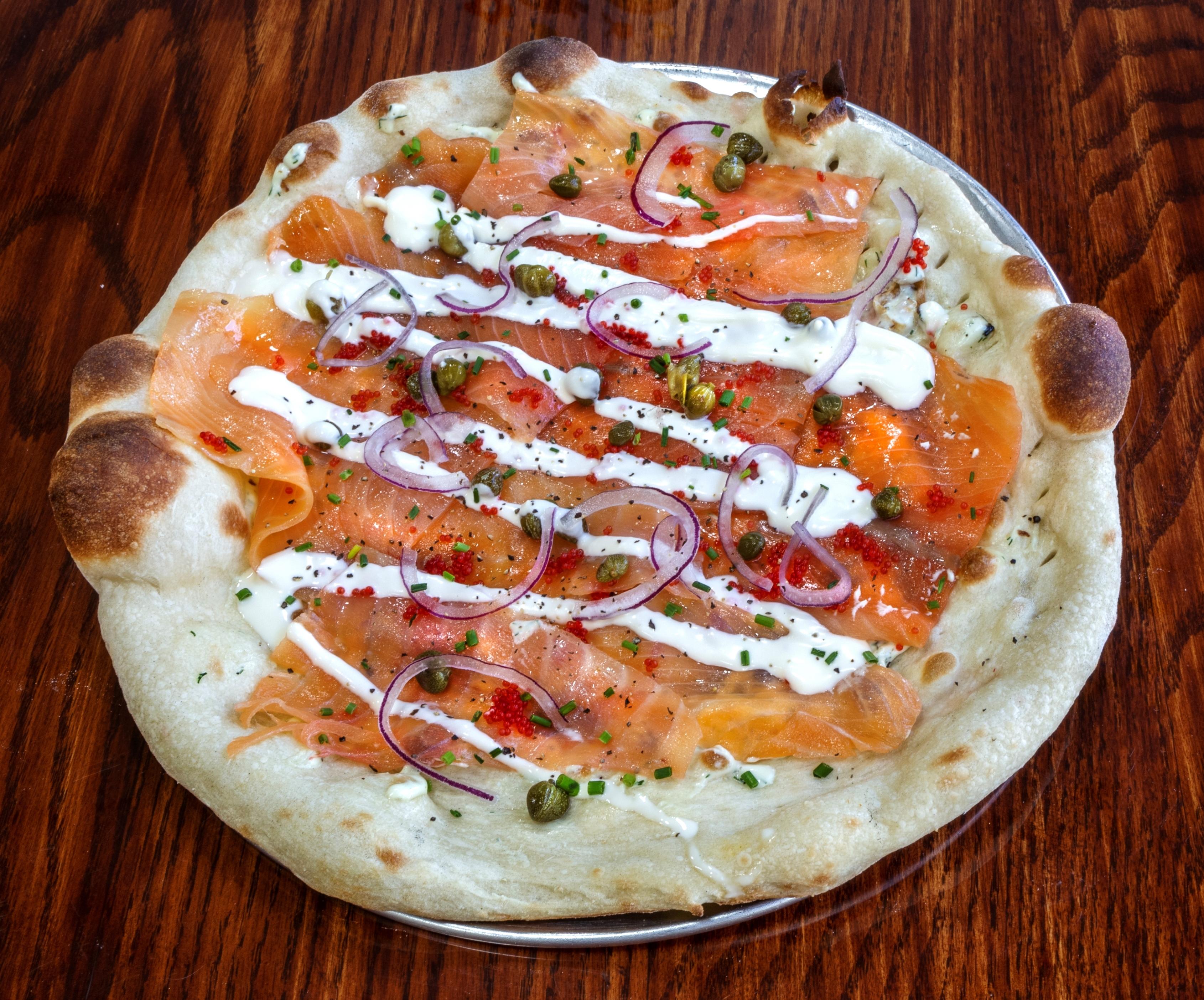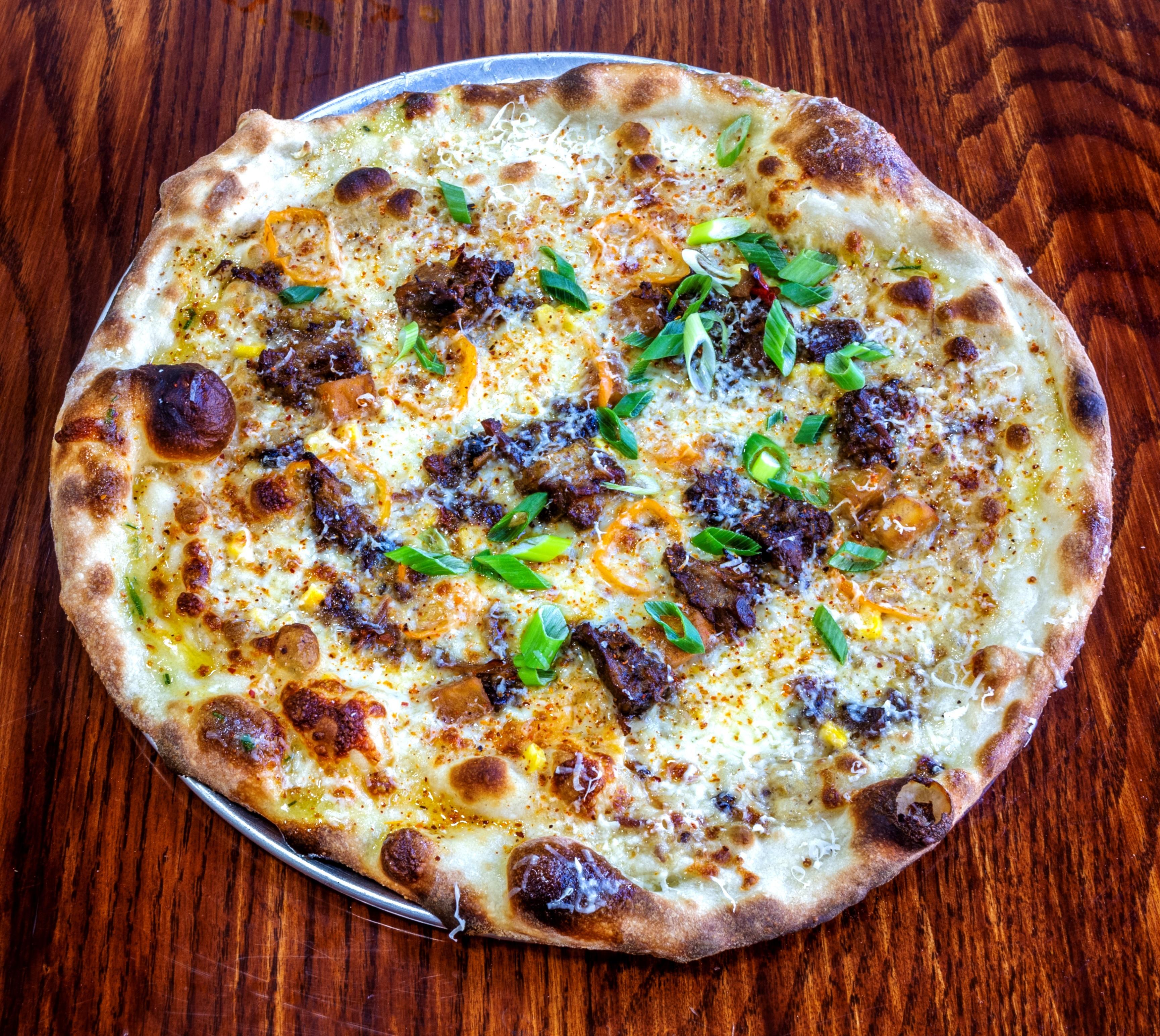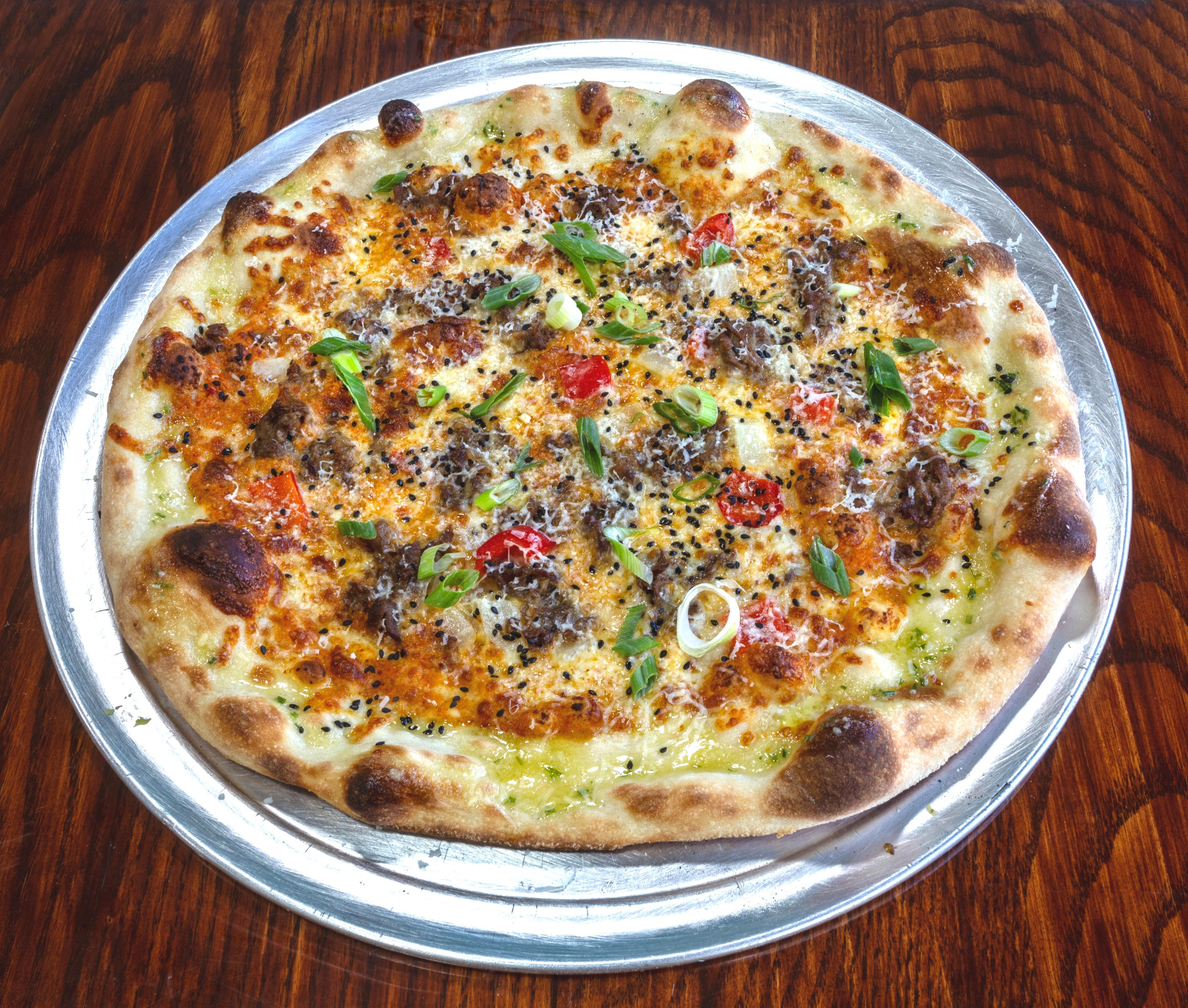 Creamy Kimchi Pizza Sauce, Bulgogi Marinated Ribeye, Onions, Peppers, Jalapenos, and Mozzarella finished with a Sweet and Spicy Garlic Chili Sauce, Sesame seeds and Green Onions