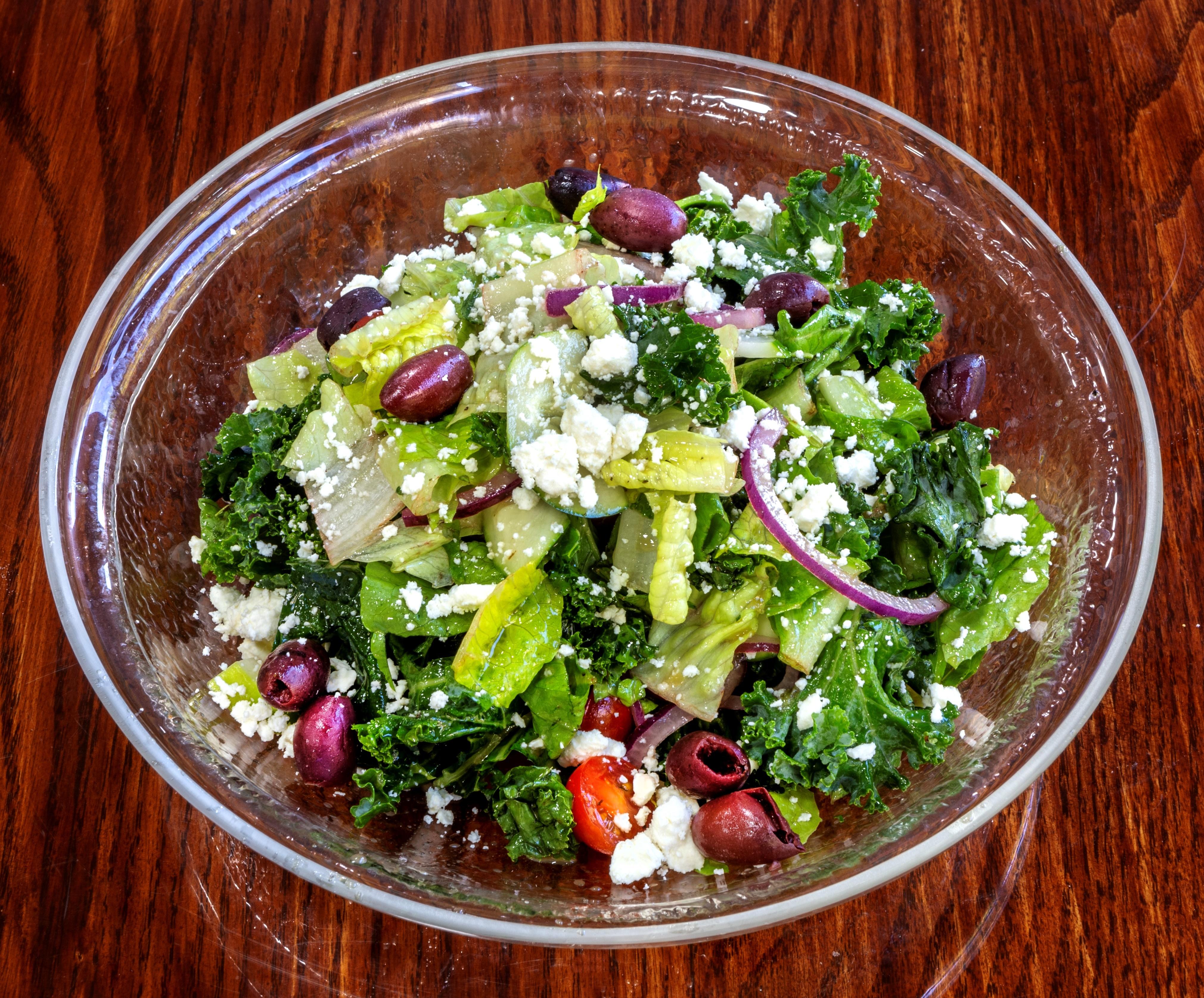Kale and Romaine topped with Kalamata Olives, Shaved Red Onion, Feta Cheese and Red Wine Vin