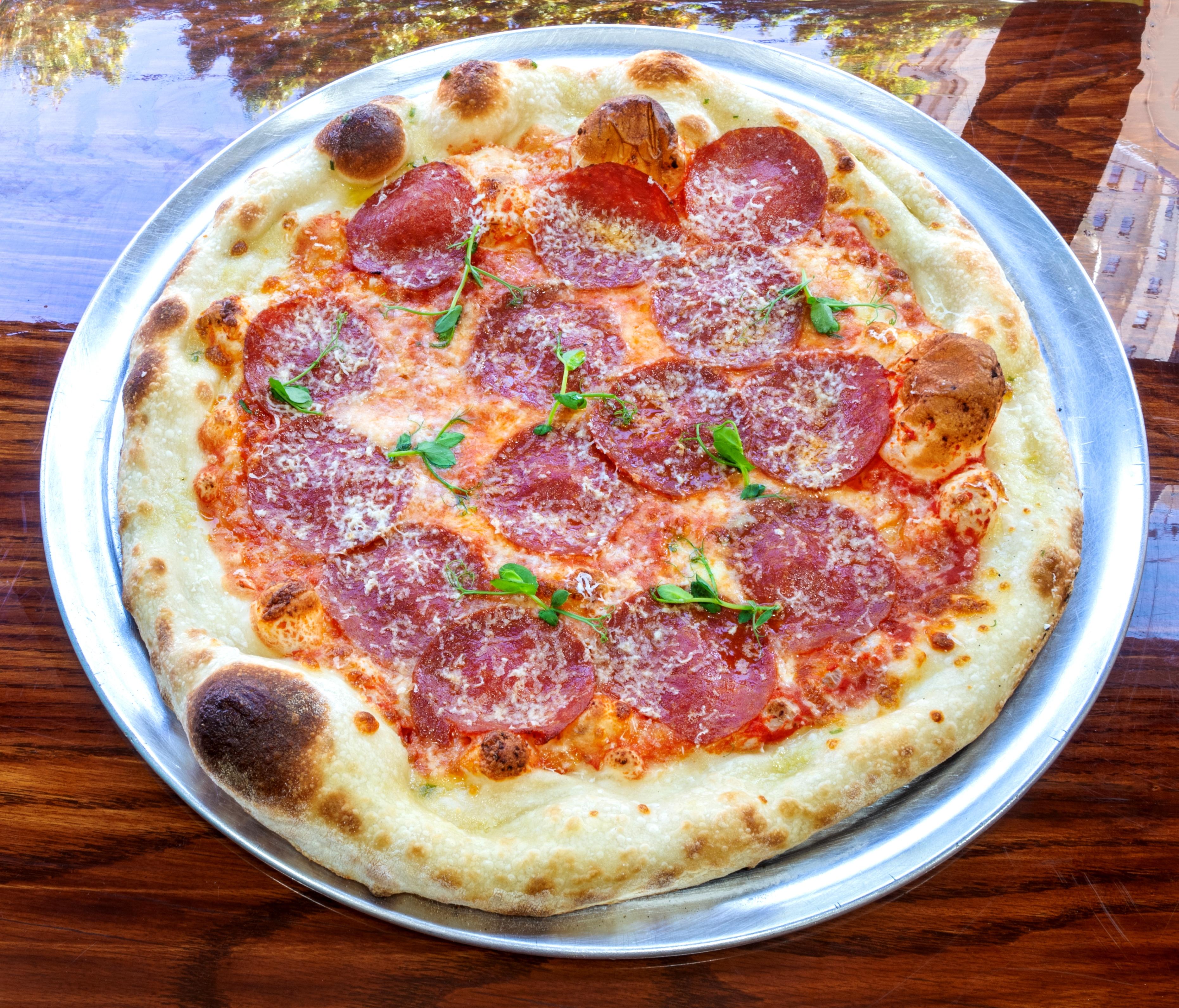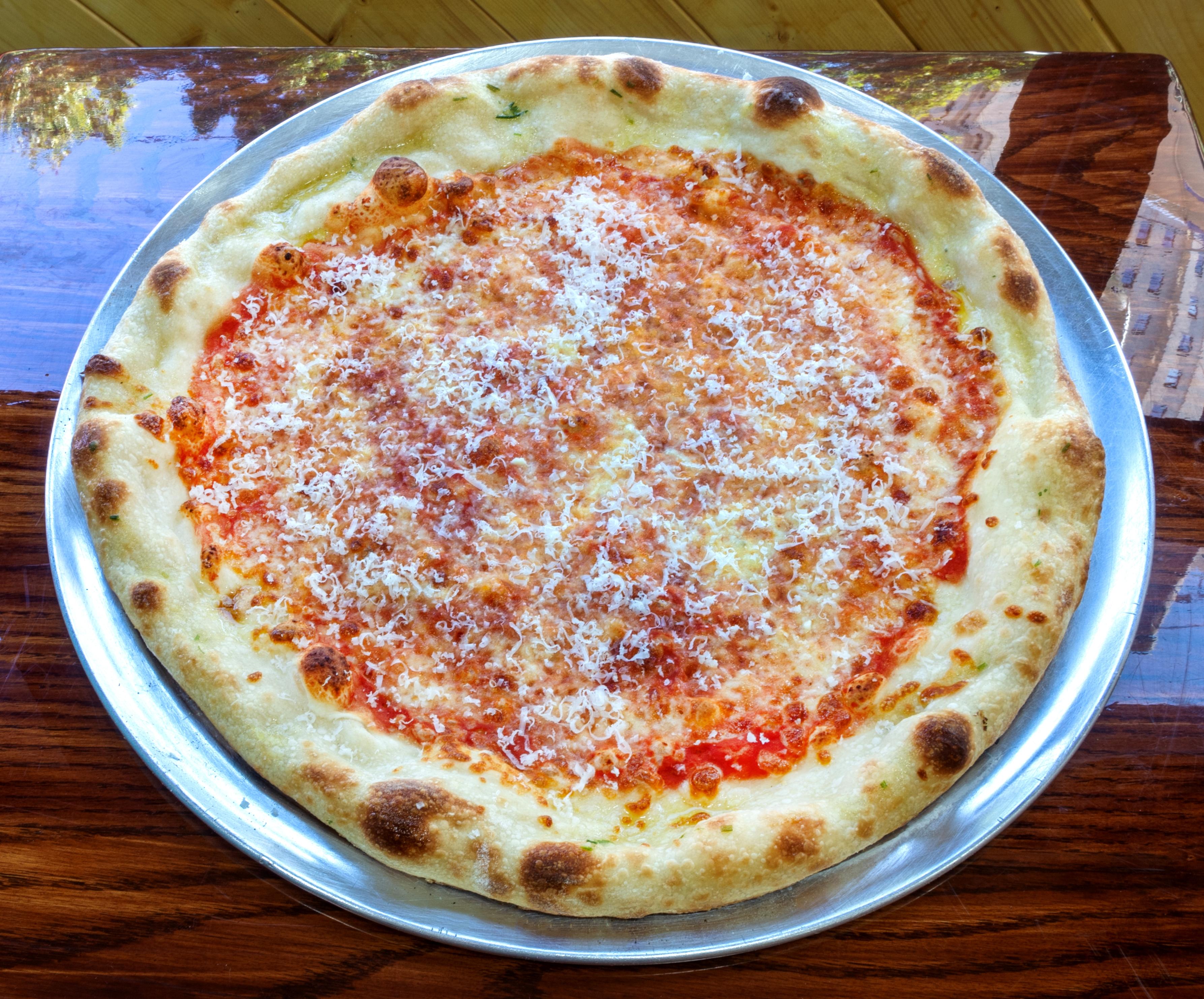 Tomato Sauce topped with Mozz, Grated Pecorino and thin Shaved Pepperoni.