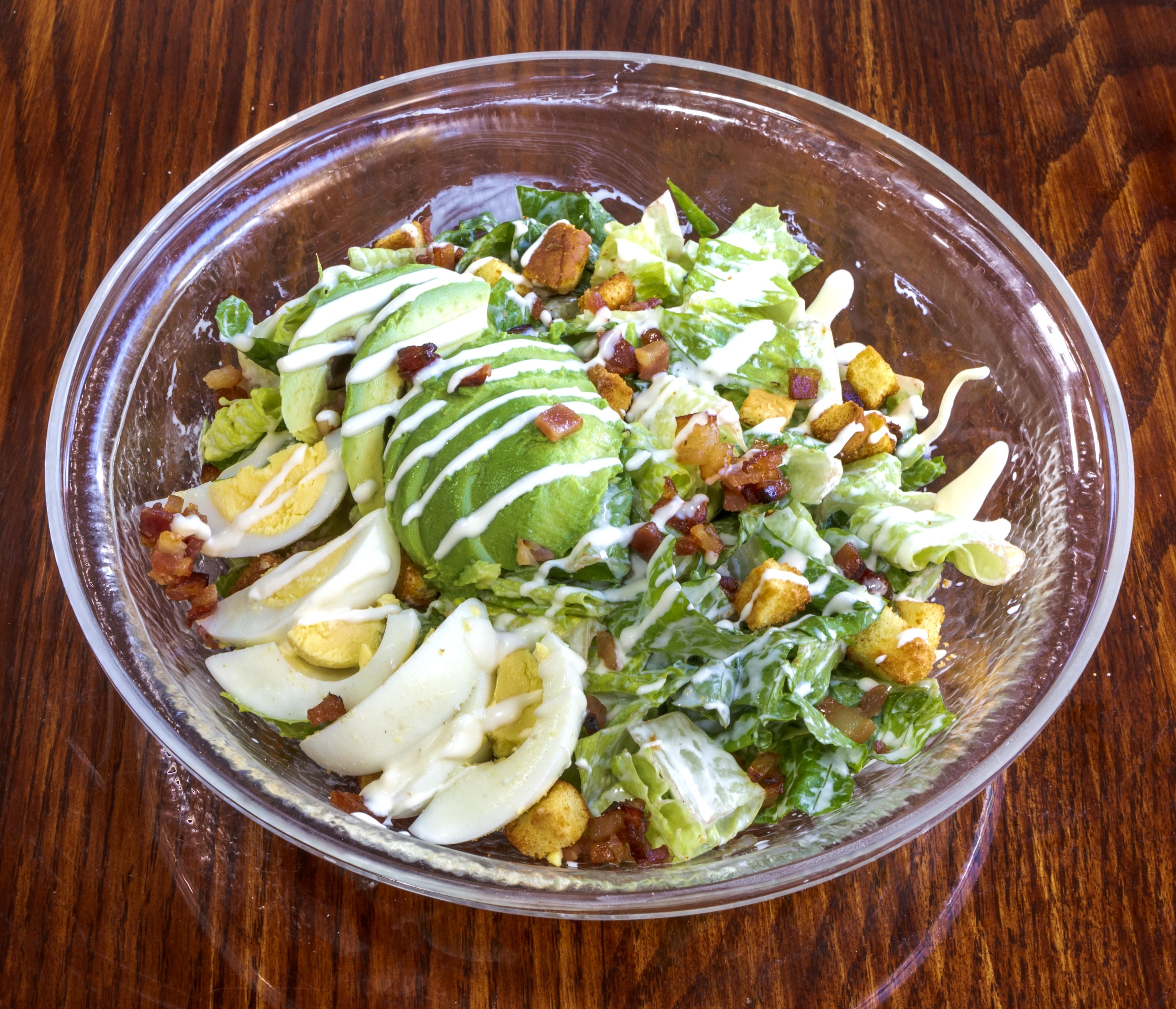 Romaine Lettuce, Avocado, Boiled Egg, Bacon and Croutons topped with Homemade Ranch Dressing.