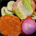 Spiced (Salt & Pepper, Coriander, Cumin) Black Bean patty blended with Green pepper, red pepper, Butternut Squash, Corn, Cilantro, , Flax seed (JAIN) with Romaine Lettuce and Tomato.