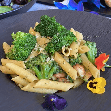 Linguini pasta, roasted butternut squash, cherry tomatoes, fresh spinach, basil, roasted pine nuts. Topped with parmesan cheese