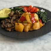 Potatoes, Tomatoes, Mushroom, Kale, spinach, Avocado. Choice of rice and beans or breakfast potatoes