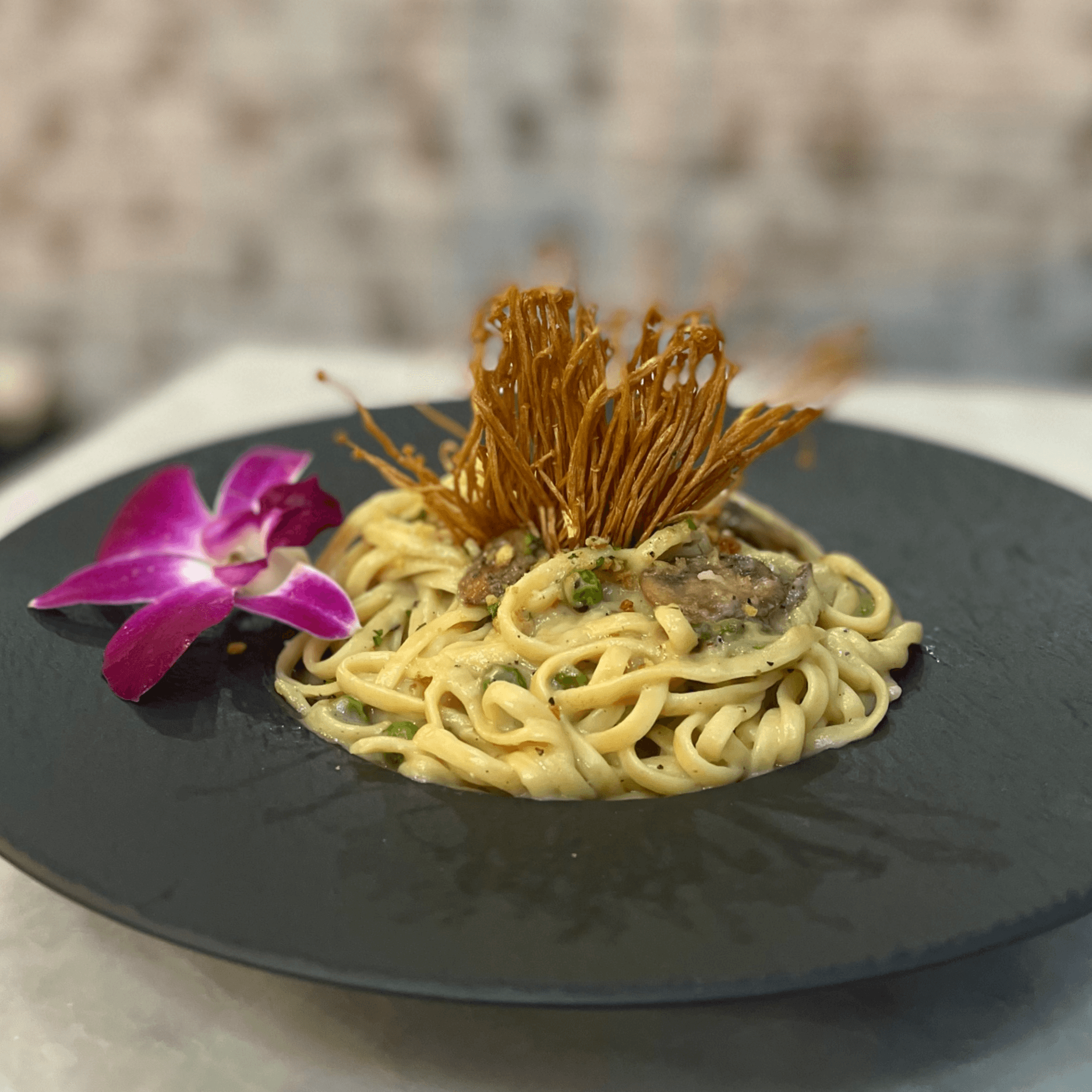 Linguine in cauliflower alfredo sauce, roasted mushroom and peas, topped with crispy enoki