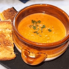 Oven roasted Roma tomatoes blended with garlic and onions served with a Vegan-based Grilled Cheese Sandwich