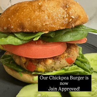 Chickpea Burger consisting of Green pepper, red pepper, Butternut Squash, Corn, Cilantro, Salt & Pepper, Coriander, Cumin, Flaxseed (JAIN) with Romaine Lettuce and Tomato.